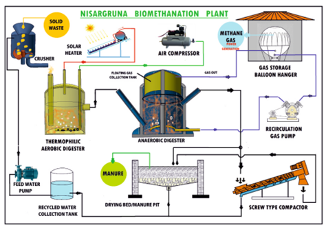 The Nisargruna biogas plant offers “Zero garbage – Zero effluent” and processes various biodegradable wastes, including kitchen waste, through a combination of aerobic and anaerobic digestion. The process yields biogas with a methane content of 70–80%, suitable for cooking or heating. Additionally, it produces a weed-free organic manure slurry with a carbon-to-nitrogen ratio of 12:1 to 16:1, serving as an effective soil conditioner. This technology reduces reliance on synthetic fertilizers and supports circular food production systems.